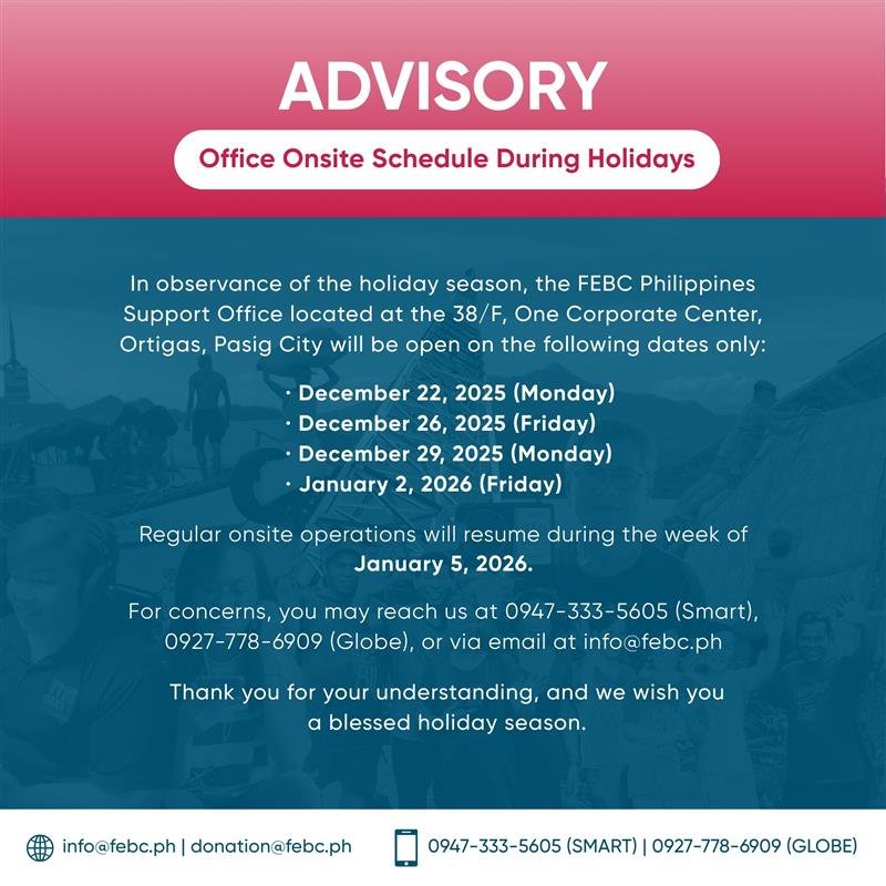 In observance of the holiday season, the FEBC Philippines Support Office (38th Floor, One Corporate Center, Ortigas, Pasig City) will be open on the following dates only: